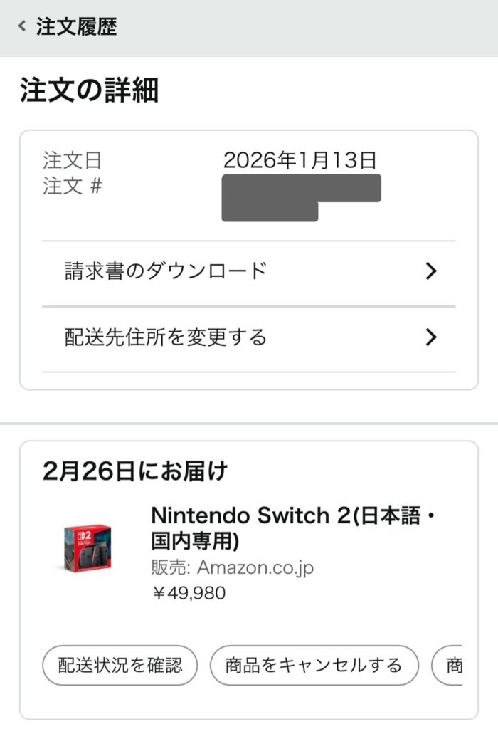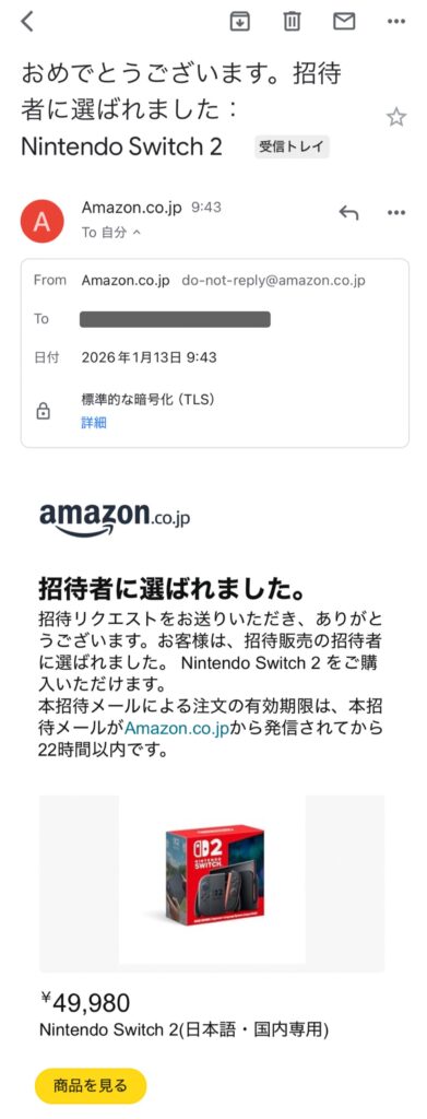 だいぶ前に応募していたAmazonのSwitch2の抽選に当たったので、応募から当選、注文までの流れを誰かの参考になればと思い残しておく。